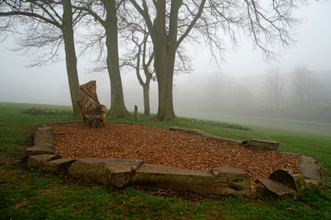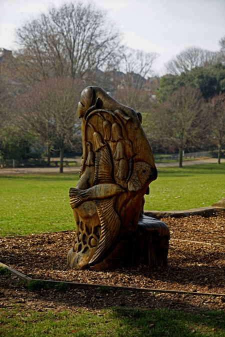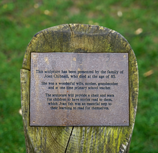 The Storyteller's Chair was carved by WoodlandCentre and installed in 2011. They have sculptures in other parks in Brighton and Hove, as well as in many well known places such as Kew Gardens and Wakehurst Place.