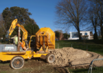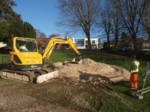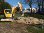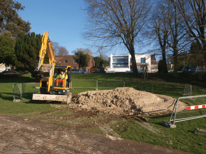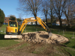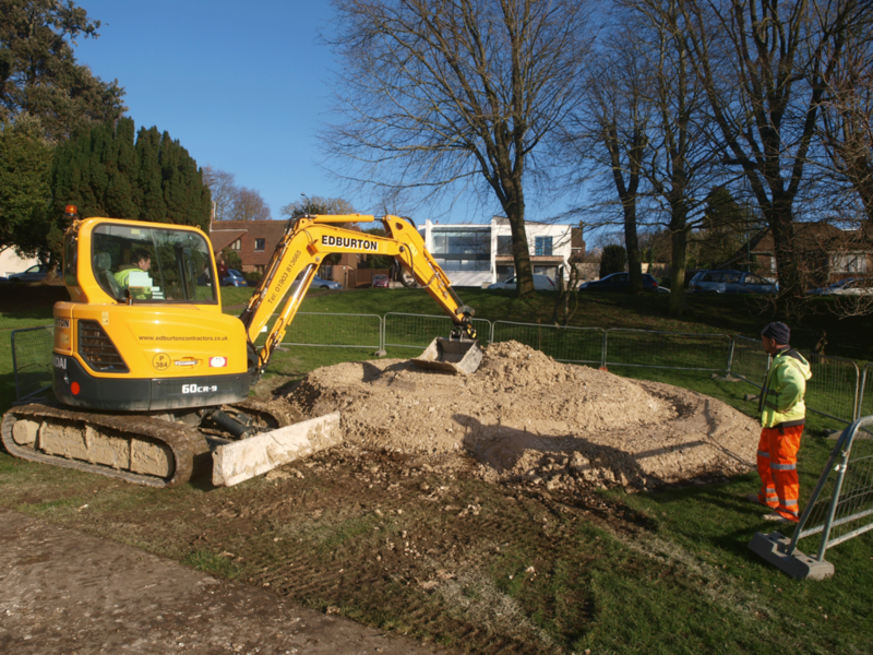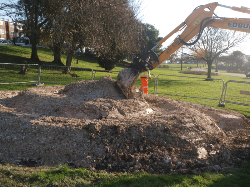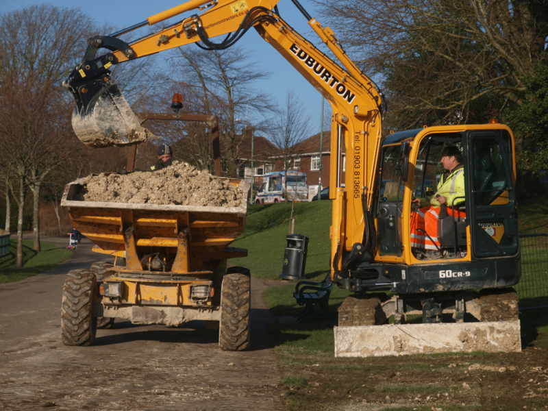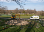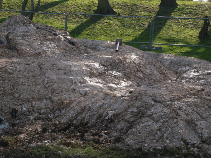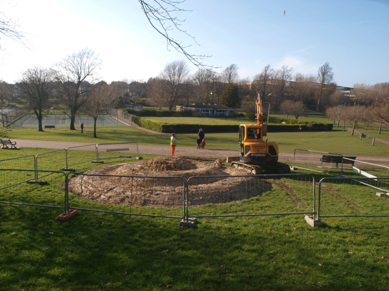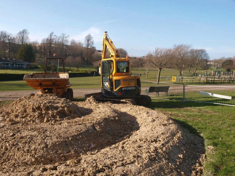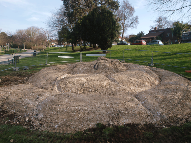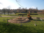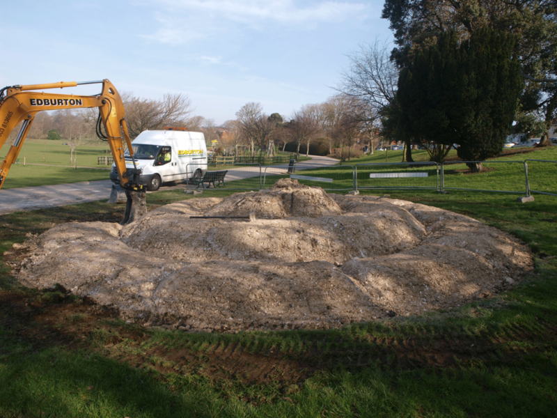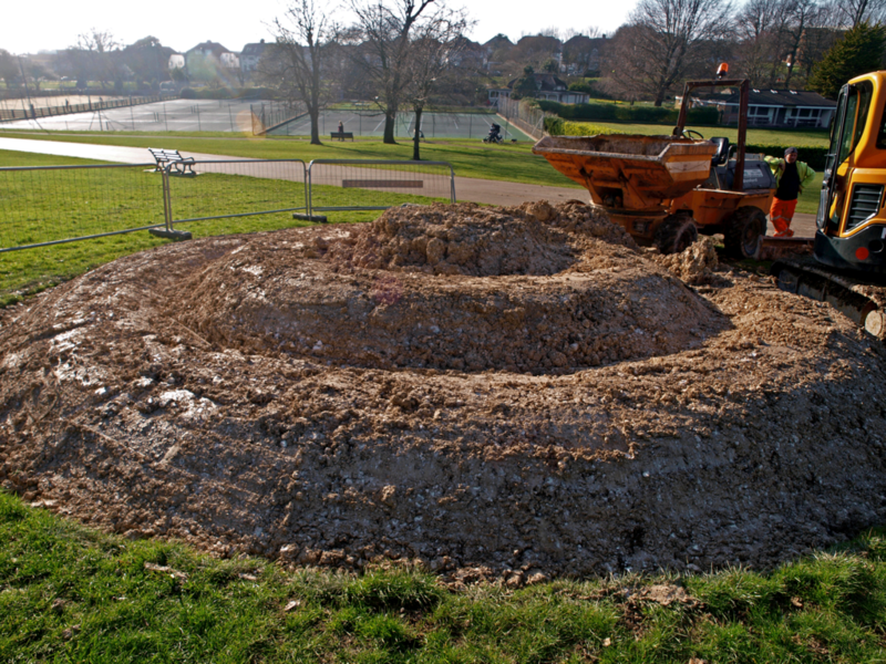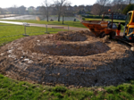 This took place in March 2014, and involved briinging in and shaping a chalk mound into a shell shape, and then covering it with a thin layer of topsoil ready for planting.