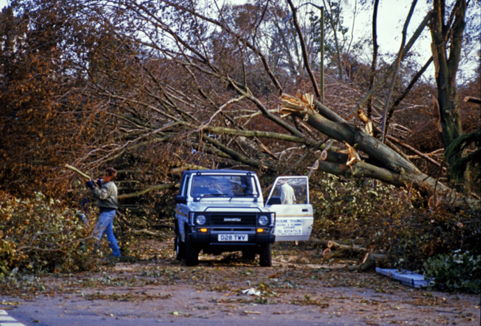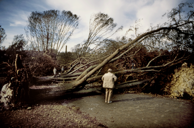 Wanderlust676 on Flickr has a number of photographs of Hove Park with trees uprooted. The photograph that this link gives shows the telephobe box at the junction of Goldstone Cresent and The Droveway; now somewhat isolated, before the Great Gale it was hemmed in by trees and bushes.