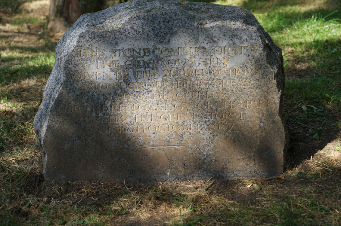 This commemoration stone can be found beside the path on the south side of the park, near the Goldstone. The lettering is indistinct now, and can only be read when the light catches the stone at a suitable angle.